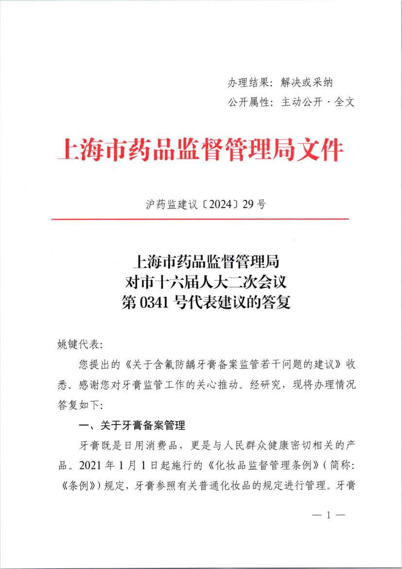 您提出的《关于含氟防龋牙膏备案监管若干问题的建议》收悉。感谢您对牙膏监管工作的关心推动。经研究,现将办理情况答复如下: