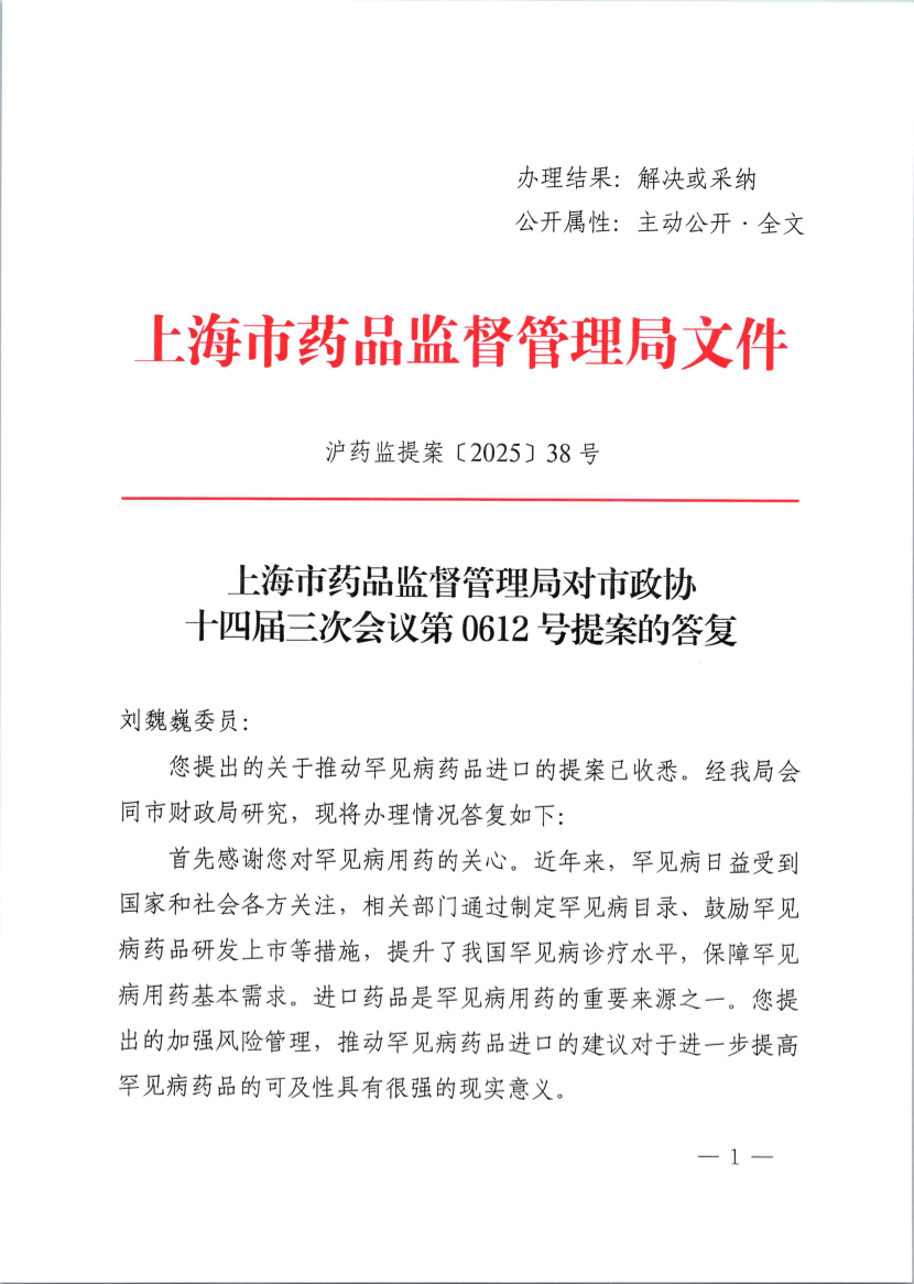 再次感谢您对罕见病用药以及药品监管工作的关心和支持。