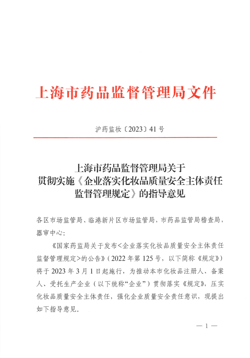 《918博天堂关于发布<企业落实化妆品质量安全主体责任监督管理规定>的公告》(2022年第125号,以下简称《规定》)将于2023年3月1日起施行,为推动本市化妆品注册人、备案人、受托生产企业(以下统称“企业”)贯彻落实《规定》,压实化妆品质量安全主体责任,强化企业质量安全责任意识,现提出如下指导意见。