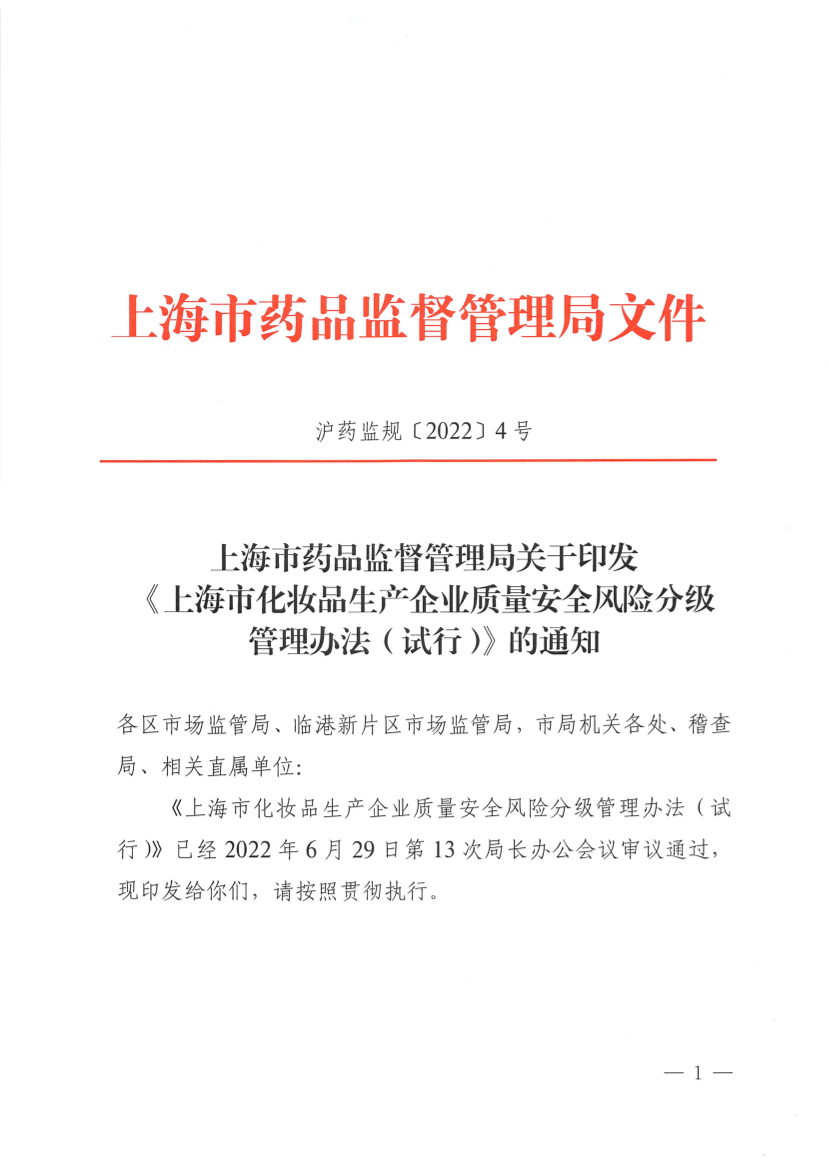 (有效期至2024年8月31日)918博天堂关于印发《上海市化妆品生产企业质量安全风险分级管理办法(试行)》的通知
