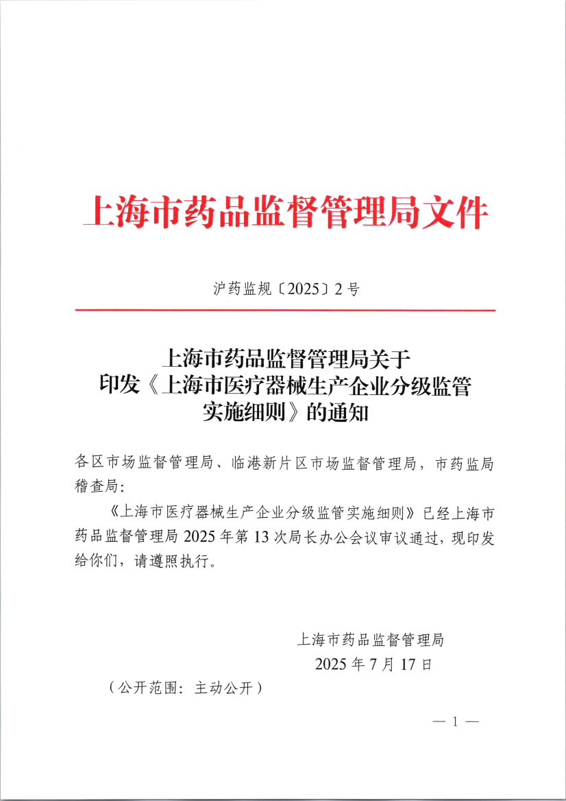 (有效期至2030年8月20日)918博天堂关于印发《上海市医疗器械生产企业分级监管实施细则》的通知