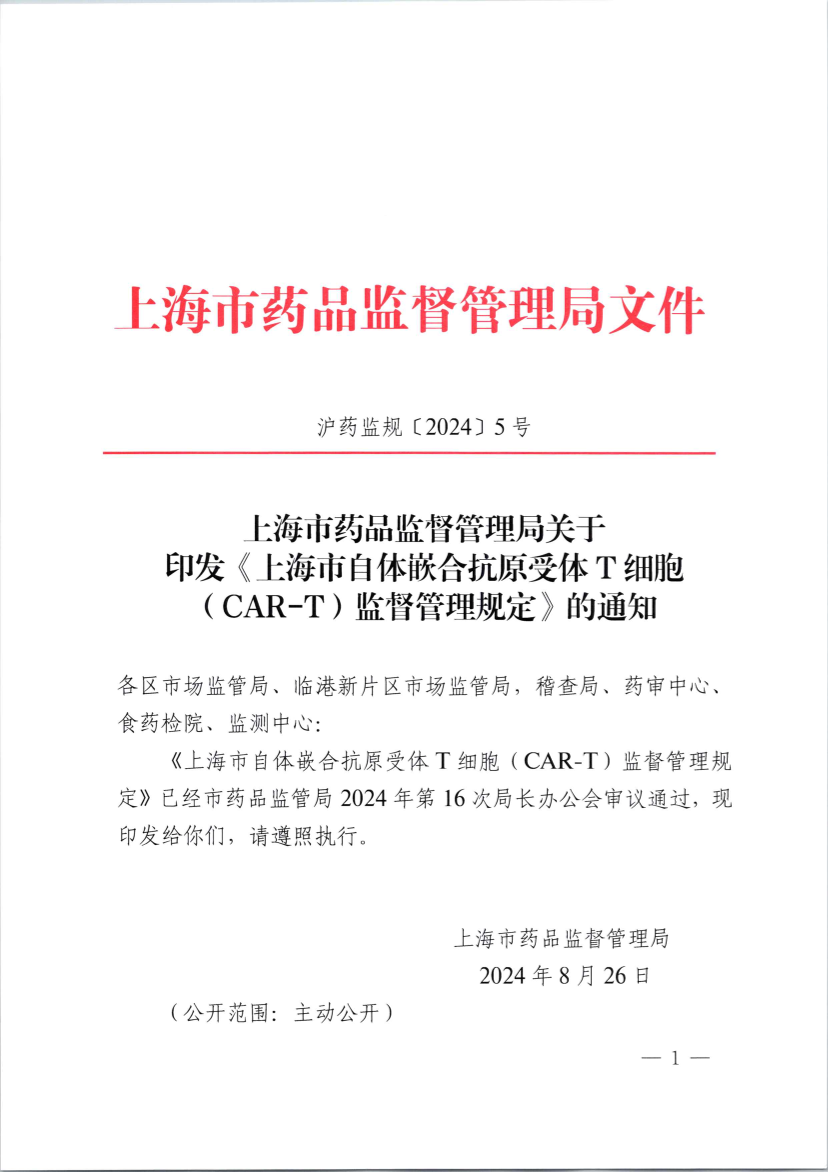 (有效期至2029年8月31日)918博天堂关于印发《上海市自体嵌合抗原受体T细胞(CAR-T)监督管理规定》的通知