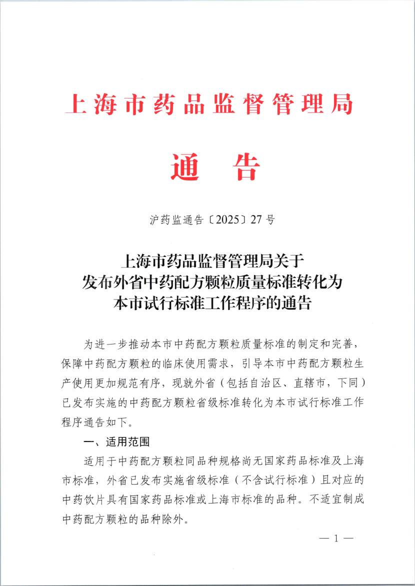 为进一步推动本市中药配方颗粒质量标准的制定和完善,保障中药配方颗粒的临床使用需求,引导本市中药配方颗粒生产使用更加规范有序,现就外省(包括自治区、直辖市,下同)已发布实施的中药配方颗粒省级标准转化为本市试行标准工作程序通告如下。