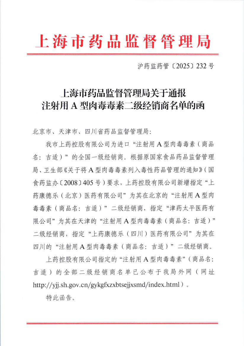 上药控股有限公司指定的“注射用A型肉毒毒素”(商品名:吉适)的全部二级经销商名单已公布于我局外网(网址http://m.ofto.cc/gykgfxzxbtsejjxsmd/index.html)。